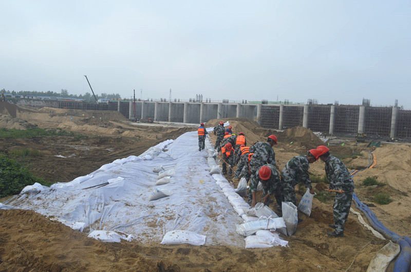 防洪度汛演练模拟的是洪水来袭,值班人员巡视围堰时发现薄弱处有决口的危险,值班人员迅速向报告,召集抢险大队成员携带防汛工具和物资迅速集结,通过填筑沙袋、抛石、打桩等措施消除围堰隐患,保证了工程安全。