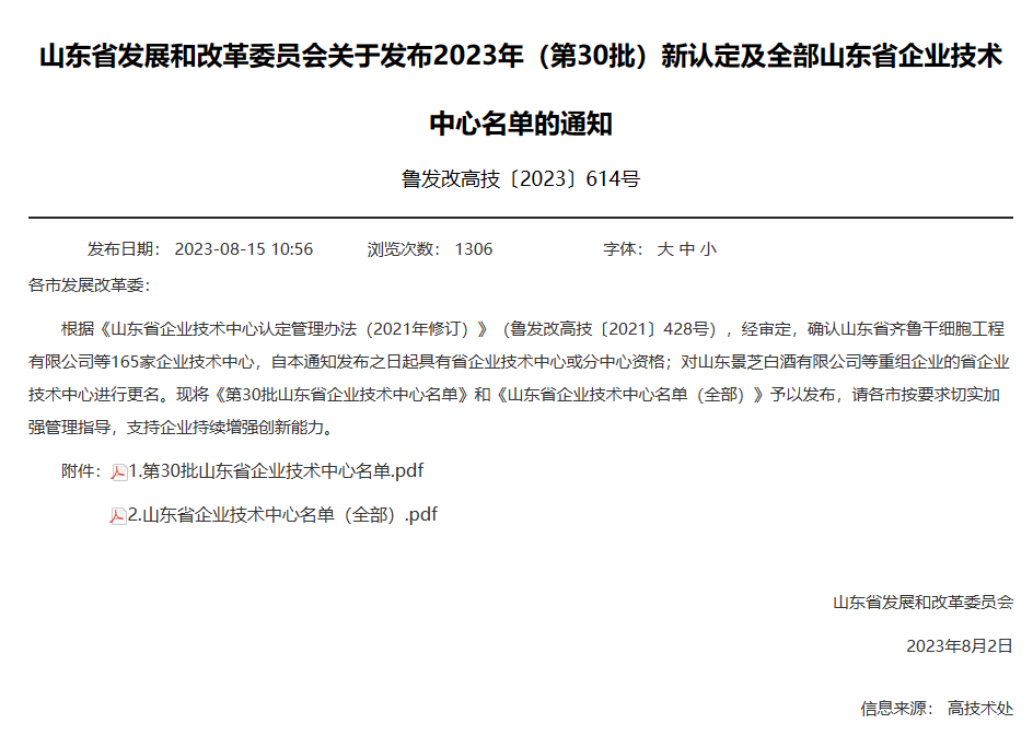 8月15日,山东省发展和改革委员会发布2023年山东省企业技术中心名单,星空官方web版入口-星空(中国) 凭借自身综合创新能力成功入选,获评山东省企业技术中心称号。
