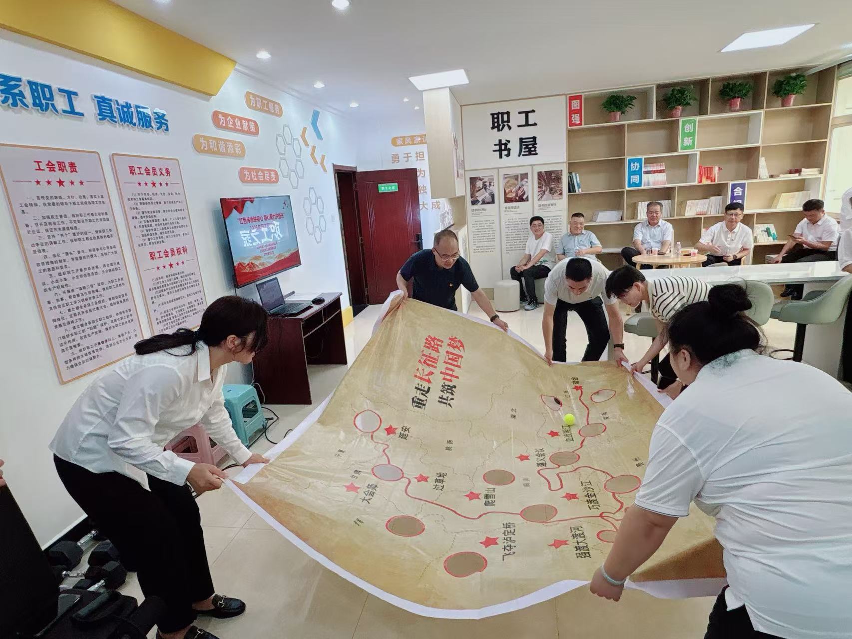 “踏寻长征印记,聚力闯关征途”环节以精心绘制的长征行军路线图为指引,带领职工“重走”长征路。各小组争分夺秒向“大会师”目标进发,每通过一个关卡都仿佛触摸到那段波澜壮阔的历史,在协作闯关的过程中,深刻感悟长征精神的伟大内涵。