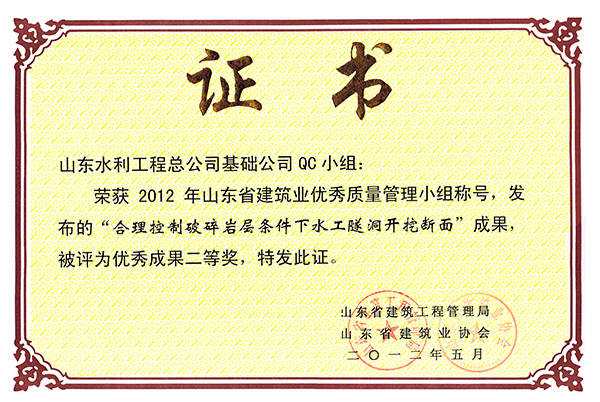 星空官方web版入口-星空(中国) “合理控制破碎岩层条件下水工程隧洞开挖断面”等两项成果荣获2012年山东省建筑业优秀质量管理优秀成果二等奖