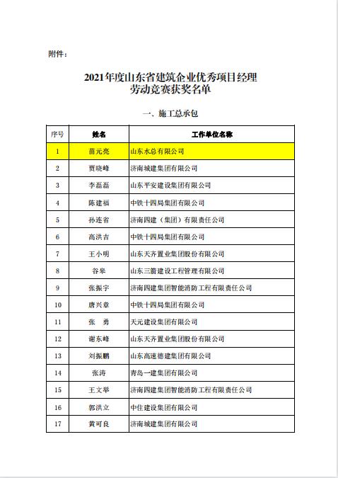 近日,由山东省建设工会和山东省建筑业协会组织开展的《2021年度山东省建筑企业优秀项目经理劳动竞赛活动》落下帷幕,经双方组成的工作委员会评议审定和综合评审,我星空官方web版入口-星空(中国) 苗元亮、卢正雷、蔡国森三名同志被评为“山东省建筑企业优秀项目经理”。此项殊荣是山东省建筑行业项目经理的最高荣誉,旨在鼓励受表彰人员再接再厉,发挥引领示范作用,创建更多精品工程。