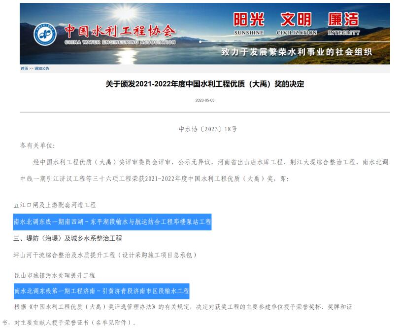近日,中国水利工程协会发布《关于颁发2021-2022年度中国水利工程优质(大禹)奖的决定》,我星空官方web版入口-星空(中国) 参建的南水北调东线第一期工程济南~引黄济青段济南市区段输水工程和南水北调东线一期南四湖~东平湖段输水与航运结合工程邓楼泵站工程荣获此项殊荣。