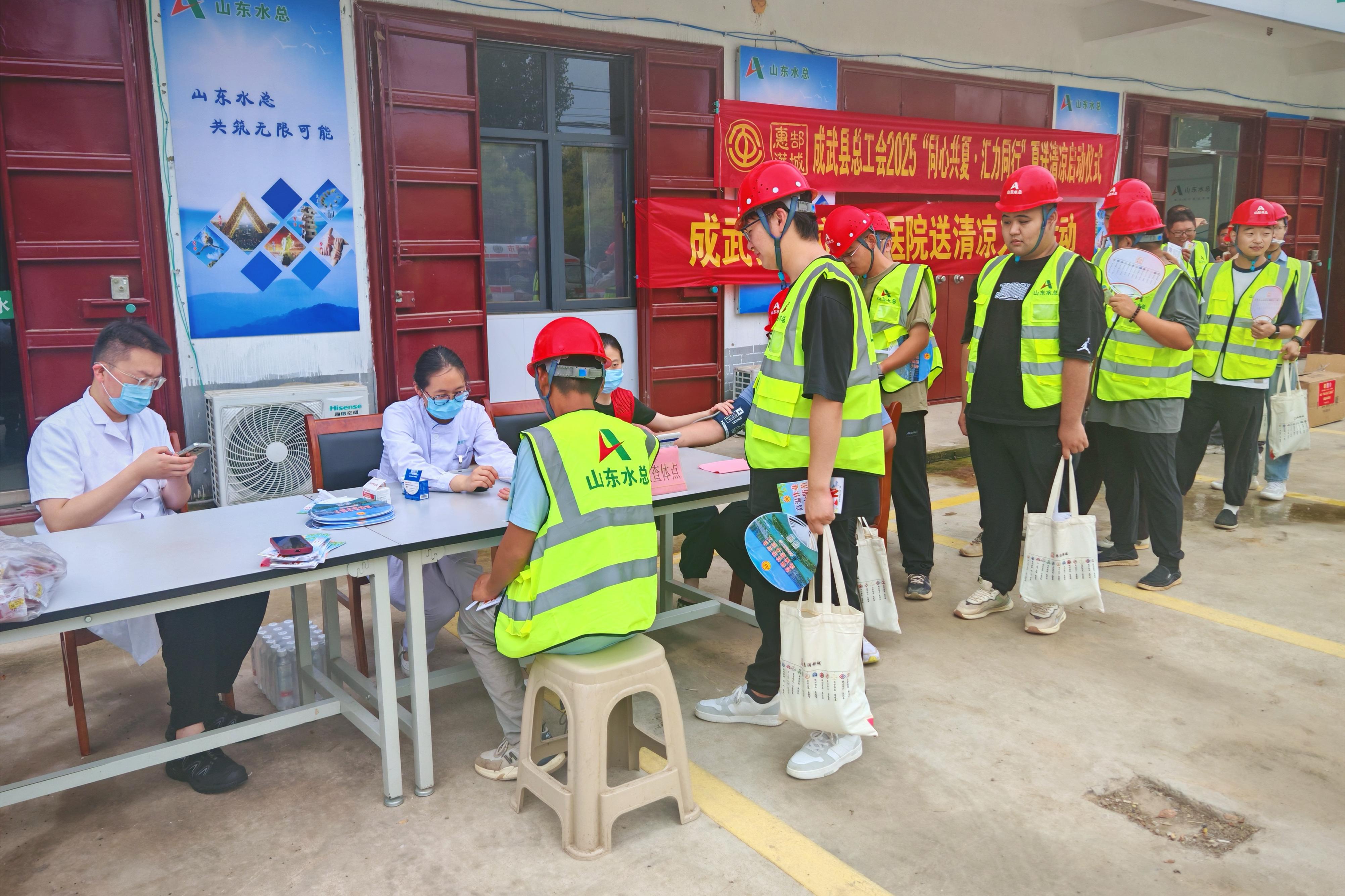 7月23日,菏泽市成武县总工会、成武县公立中医医院一行赴基础有限星空官方web版入口-星空(中国) 成武县引调水工程项目部,开展“同心共夏 汇力同行”夏送清凉活动,慰问高温下奋战的一线工作人员。