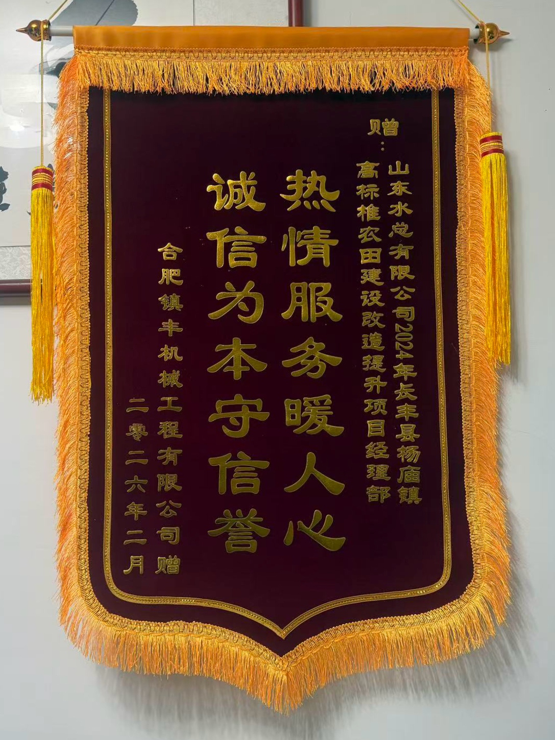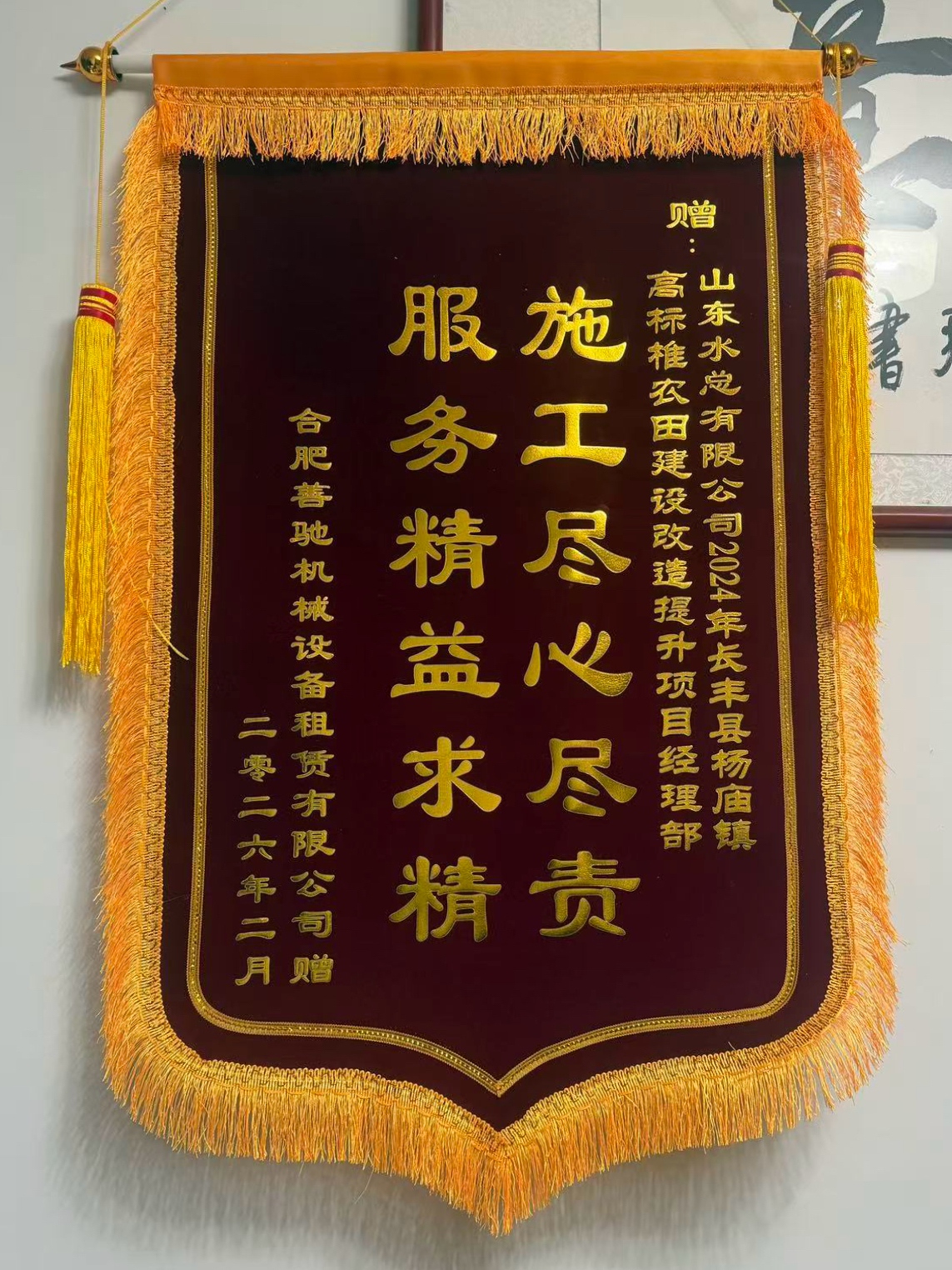 近日,基础有限星空官方web版入口-星空(中国) 安徽省长丰县杨庙镇高标准农田建设提升改造项目部收到了来自合肥善驰机械设备租赁有限星空官方web版入口-星空(中国) 和合肥镇丰机械工程有限星空官方web版入口-星空(中国) 赠送的锦旗。