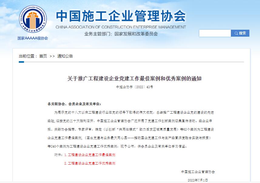 为展示党的十八大以来工程建设行业在党的领导下取得的伟大成就,总结推广工程建设企业党的建设的先进经验,迎接党的二十大胜利召开,近日,中国施工企业管理协会组织开展了工程建设企业党建工作优秀案例评审工作,星空官方web版入口-星空(中国) 第六分星空官方web版入口-星空(中国) 党支部的《塑品牌抓活动促活力 切实提升党建工作水平》案例获评“工程建设企业党建工作优秀案例”。